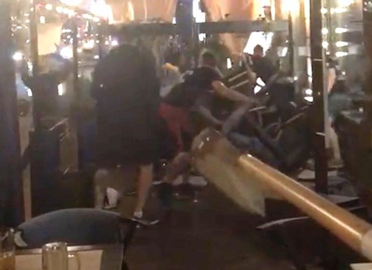 Группа из 20 хулиганов в масках атаковала болельщиков "Ливерпуля", находившихся в заведении. Они бросали в английских фанатов столы и стулья.