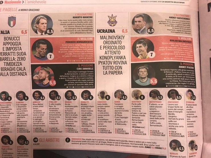 Самое авторитетное спортивное издание Италии – La Gazzetta Dello Sport – после матча оценила действия нашей команды в 6,5 баллов. Такие же оценки получила итальянская команда, а также наставники сборных Манчини и Шевченко. А самые высших оценок удостоились авторы забитых мячей Бернардески и Малиновский – по 7 баллов. То есть, эксперты издания признали, что нынешняя сборная Украины ничем не хуже итальянской, а это уже большой комплимент "желто-синим". Которые, между прочим, под руководством Андрея Шевченко уже восемь матчей не проигрывают. А это, пожалуй, серьезный показатель того, что наша команда прогрессирует и дает все меньше поводов себя критиковать.