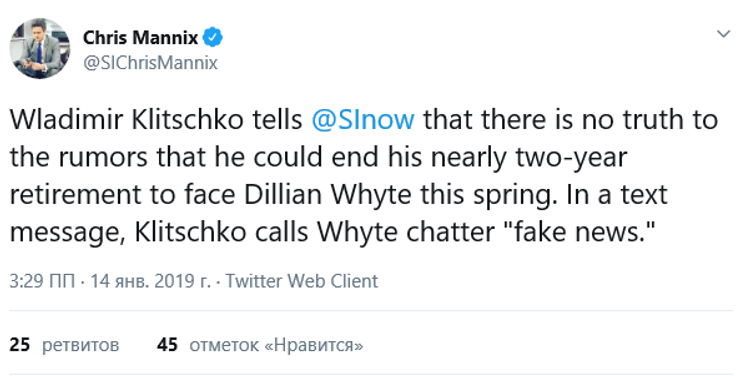 "Владимир Кличко заявил изданию, что слухи о его возвращение в ринг этой весной для боя против Диллиана Уайта ложь. В текстовом сообщение Кличко назвал болтовню (по поводу боя с Уайтом) fake news", - заявил Мэнникс.