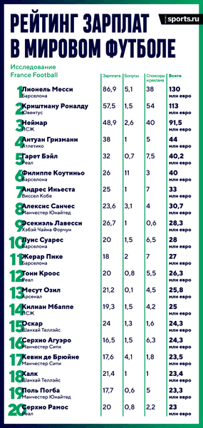 France Football – одно из ведущих мировых изданий о футболе провело исследование о зарплатах и бонусах, которые получают ведущие игроки в мире.