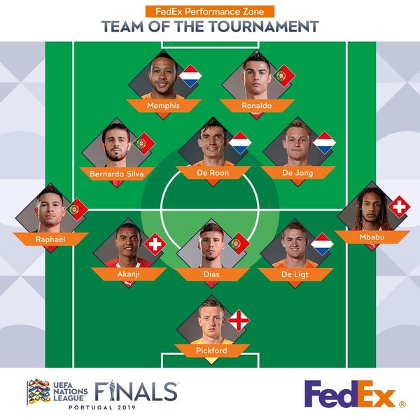 Символическая сборная: Джордан Пикфорд (Англия), Кевин Мбабу (Швейцария), Маттейс де Лигт (Голландия), Рубен Диаш (Португалия), Мануэль Аканджи (Швейцария), Рафаэл Геррейру (Португалия), Френки де Йонг, Мартен де Рон (оба – Голландия), Бернарду Силва, Криштиану Роналду (оба – Португалия), Мемфис Депай (Голландия).