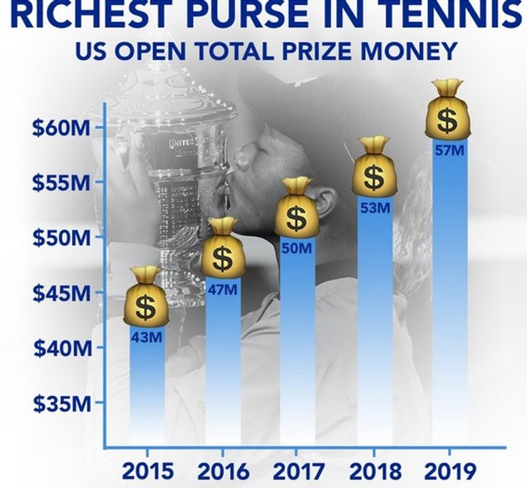 Проигравшие в первом раунде одиночных соревнований получат по 58 тысяч долларов (в 2018-м – 54 тысячи). За последние четыре года призовые за первый круг US Open возросли на 47%.