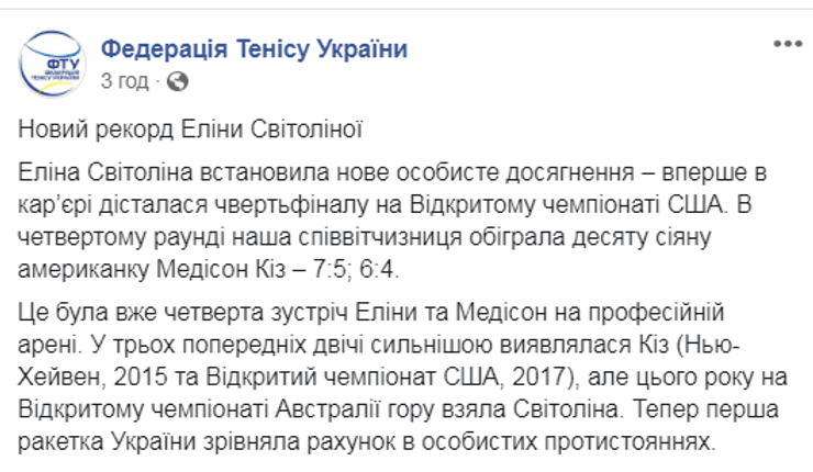 Как сообщает Федерация тенниса Украины в Facebook, Элина в 1/8 финала обыграла американку Мэдисон Киз - 7:5, 6:4.