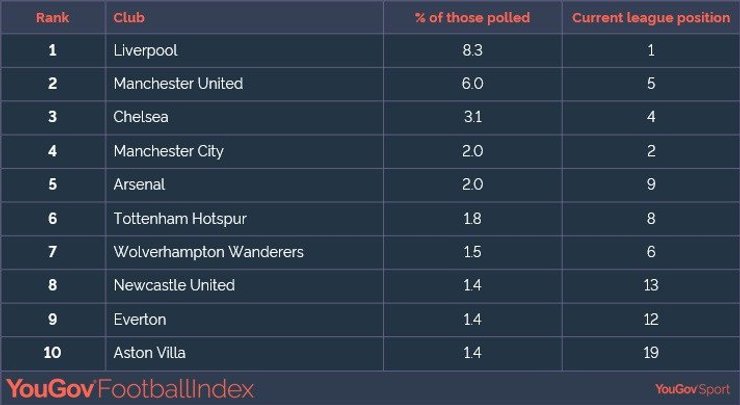 В десятку самых популярных команд Великобритании также попали "Тоттенхэм Хотспур", "Вулверхэмптон Уондерерс", "Ньюкасл Юнайтед", ливерпульский "Эвертон" и бирмингемская "Астон Вилла".