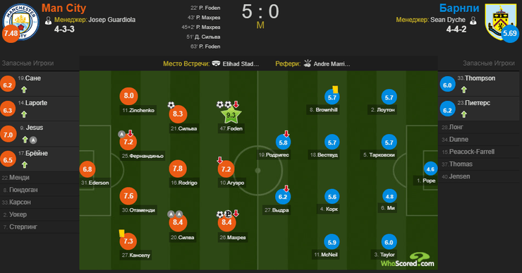 Уже в первом тайме "горожане" сняли все вопросы о победителе матча. Дубль оформил Рияд Марез, еще один гол на счету Фила Фодена.