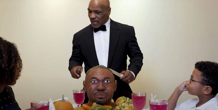Накануне выставочного поединка против экс-чемпиона мира в пяти весовых категориях Роя Джонса Майк Тайсон с семьей отметил День благодарения. Вместо традиционной индейки у легендарного боксера на столе оказался торт в виде головы Роя Джонса.