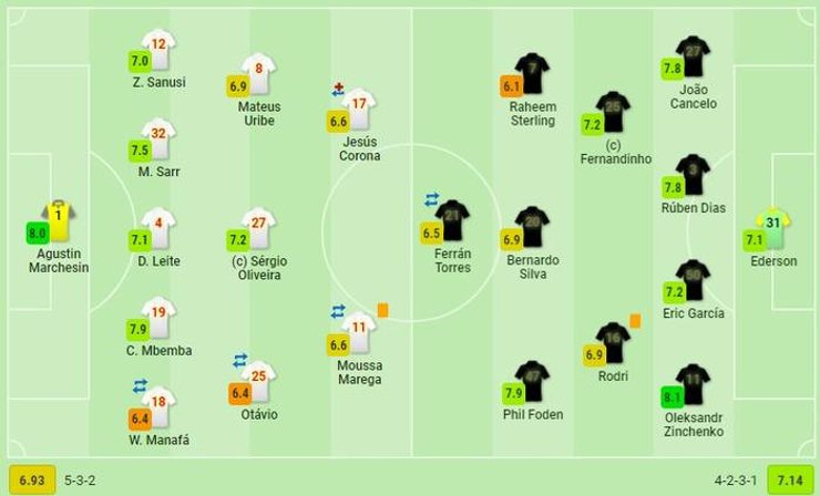 Худшим игроком "Ман Сити" был признан Рахим Стерлинг с оценкой 6.1, а лучшим в составе "Порту" – голкипер Марчесин, выступление которого оценили в 8.0.