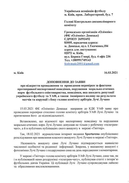 Руководство донецкого "Олимпика" обратилось с открытым письмом в Контрольно-дисциплинарный Комитет УАФ с просьбой открыть производство в отношении главы Комитета арбитров Лучано Лучи.
