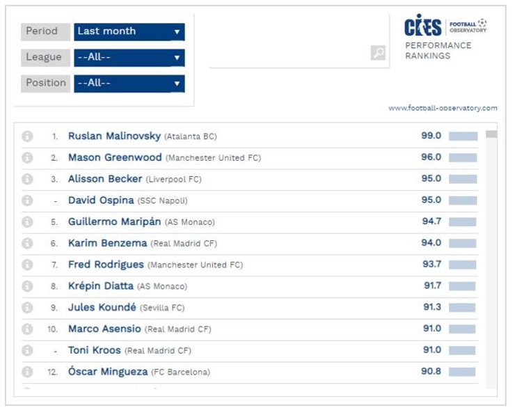 Лидером рейтинга CIES в марте стал Руслан Малиновский, получивший наивысшую оценку – 99.0 балла.