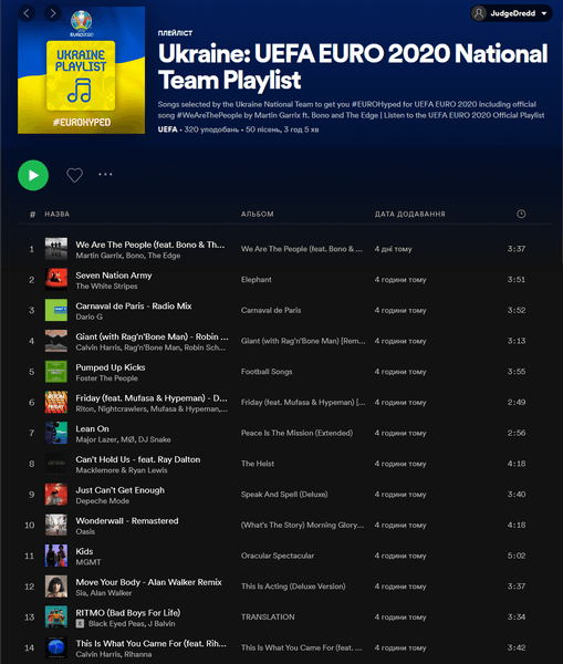 Обновленный плейлист содержит в себе 50 композиций. Однако из списка теперь пропала украинская песня "Їхали козаки" от группы "Тінь сонця". В списке на Spotify в основном иностранные композиции.