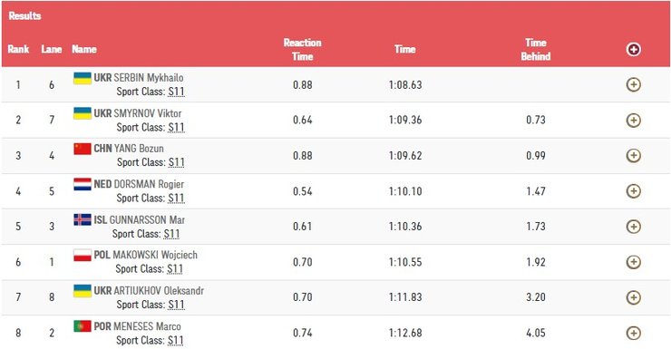 Михаил Сербин завоевал золото в заплыве на 100 метров на спине в классе S11. Он показал результат 1.08,63 минуты. Серебро в этом заплыве также получил украинец Виктор Смирнов, показавший результат на 0,73 секунды хуже.