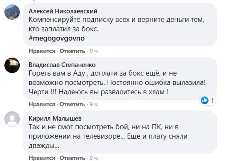 "Гореть вам в Аду, доплати за бокс еще, и не возможно посмотреть. Постоянно ошибка вылазила! Черти!!! Надеюсь вы развалитесь в хлам!", "Компенсируйте подписку всех и верните деньги тем, кто заплатил за бокс", "Так и не смог посмотреть бой, ни на ПК, ни в приложении на телевизоре… Еще и плату сняли дважды…", "Ваш удел — вести фейсбучную страничку и поздравлять виллов смиттов, а не транслировать футбол и бокс!", "Все дружно пишем заявления в общество защиты прав потребителей и в полицию. Это развод и кидалово".
