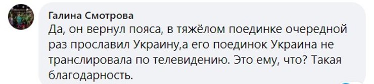 "Да, он вернул пояса, в тяжелом поединке очередной раз прославил Украину, а его поединок Украина не транслировала по телевидению. Это ему, что? Такая благодарность", – поинтересовались в комментариях.