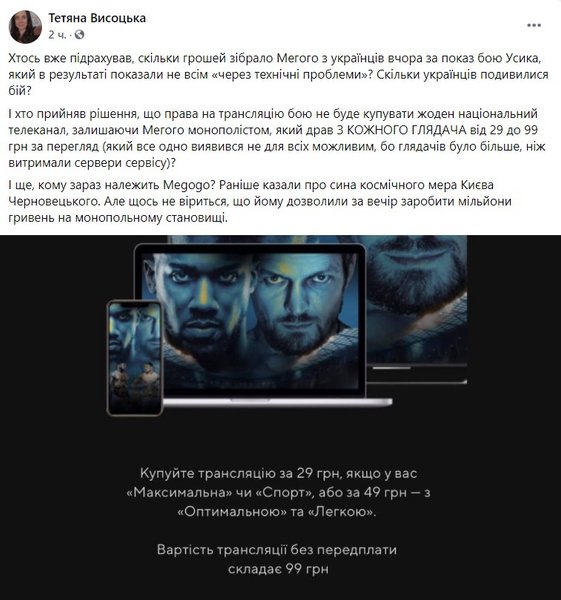 "Кто-то уже подсчитал, сколько денег собрал Мегого с украинцев вчера за показ боя Усика, который в результате показали не всем "по техническим проблемам"? Сколько украинцев посмотрели бой? И кто принял решение, что права на трансляцию боя не будет покупать ни один национальный телеканал, оставляя Мегого монополистом, который драл с каждым зрителя от 29 до 99 грн за просмотр (который все равно оказался не для всех возможным, потому что зрителей было больше, чем выдержали серверы сервиса)?", – спрашивает телеведущая Татьяна Высоцкая.