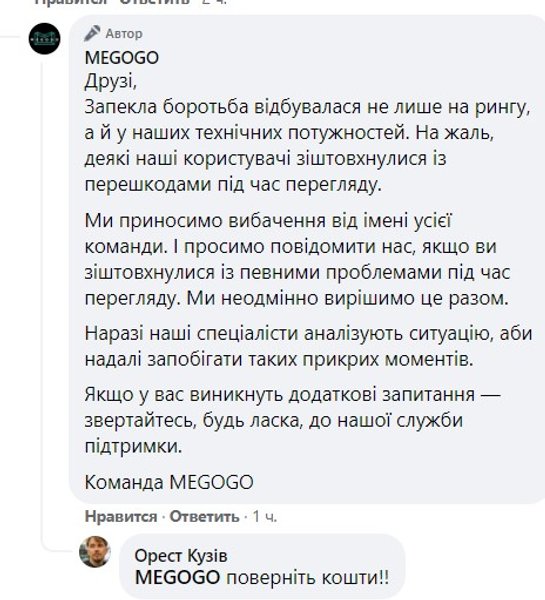 "Очень хочу посмотреть Джошуа и Усика. Имею максимальную подписку на Мегого. Захожу на эту платформу, которая выдает мне ошибку и рекомендует зайти позже … вы там на этом Мегого — идиоты, или как ??? Кто и где смотрит бокс, друзья? Подскажите, что делать, плизззз… APD. В итоге мошенники с Megogo еще и ДВАЖДЫ сняли с моей карточки по 119 грн (вместе – 238 грн) за просмотр боя, который я так и не посмотрел из-за их "технических проблем", "попробуйте позже". Верните деньги, мошенники! Пишут, что владелец Megogo — Степан Черновецкий. Почему-то я не удивлен…", – написал в Facebook журналист Егор Чичеринда.