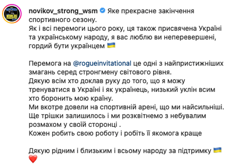 Новиков также написал о своей победе в личном аккаунте в Инстаграме и подчеркнул, что посвятил ее Украине и украинскому народу.