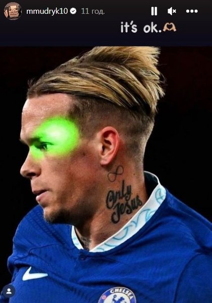 Михаил Мудрик прокомментировал инцидент в Instagram. Он опубликовал фото с лазерным светом на лице и написал: "Все нормально".