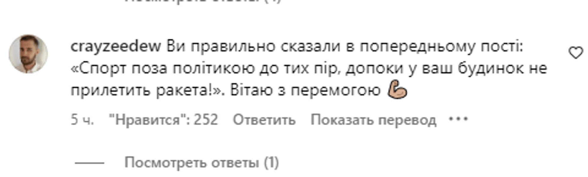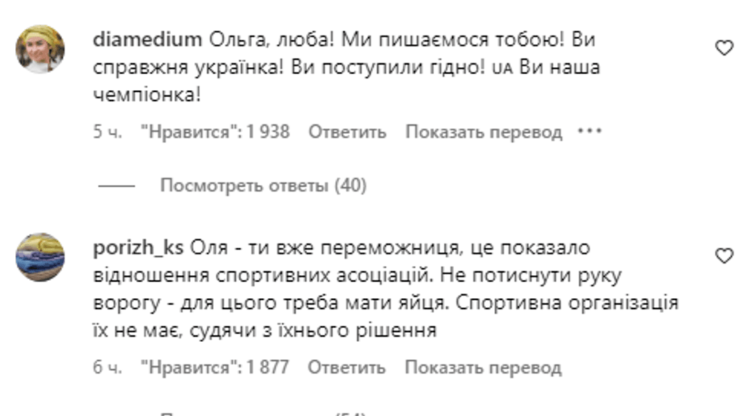 "Она победила российскую спортсменку, а потом отказалась пожать ей руку, что является правильнім решением для наших людей. Российская спортсменка ее спровоцировала, после чего Ольга была дисквалифицирована. Я считаю, что это является нестоящим неуважением со стороны Федерации фехтования. Почему россияне провоцируют? Почему они не уважают нашу позицию?", — заявила Свитолина в интервью "Голосу Америки".