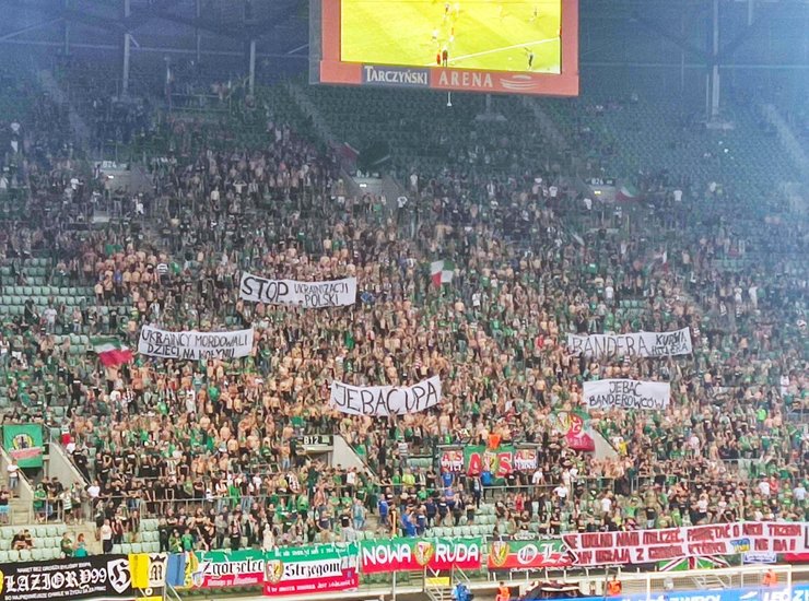 Некоторые фанаты клуба "Шленск" во Вроцлаве во время матча второго тура чемпионата Польши в матче против Заглембе (1:2) вывесили провокационные баннеры, протестуя против Украины. Фото событий на стадионе "Тарчинская Арена" в Twitter опубликовал журналист Марцин Торж.