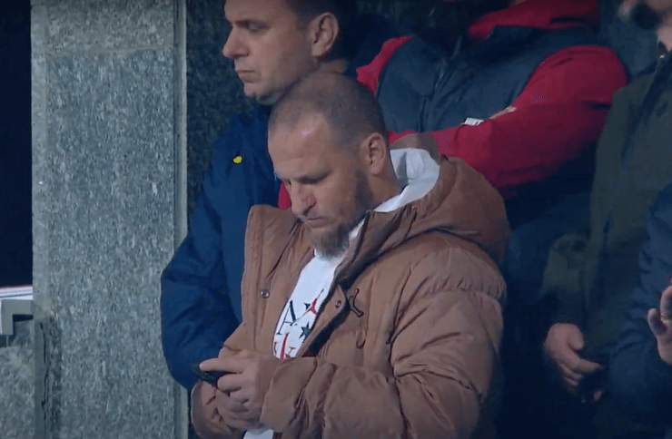 28. Пауза в игре. Алиев на трибунах напряженно смотрит в экран телефона.