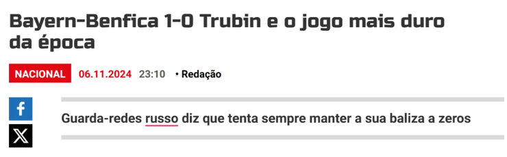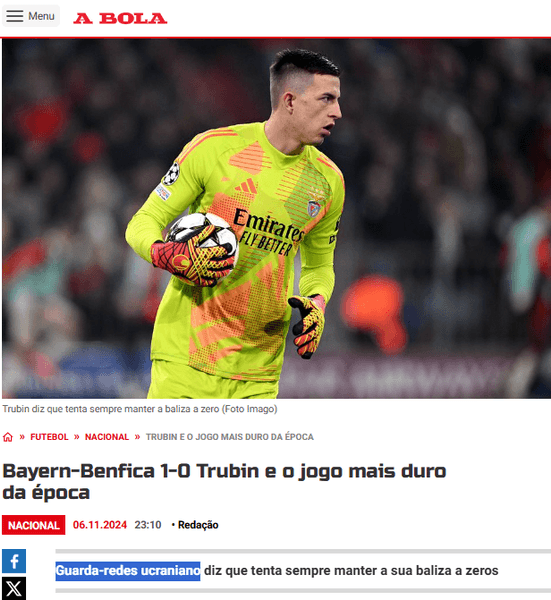 В среду, 6 ноября, в рамках 4-го тура Лиги чемпионов сезона-2024/2025 состоялся матч между "Баварией" и "Бенфикой" на "Альянц Арене" в Мюнхене. Лиссабонский клуб, за который играет украинский вратарь Анатолий Трубин, проиграл со счетом 1:0. Однако голкипер стал героем встречи, совершив 9 впечатляющих сейвов. Одно из крупнейших португальских изданий A Bola взяло интервью у Трубина назвав его "guarda-redes russo", что в переводе означает "русский вратарь".