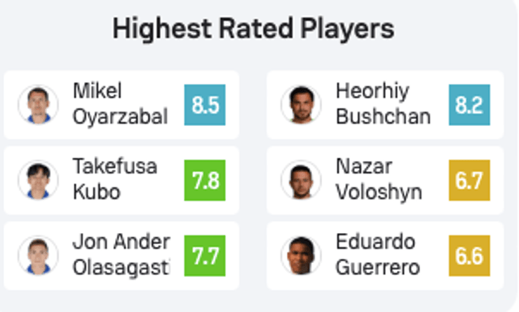 Оярсабаль, Кубо и Оласагасти — лучшие в составе "Сосьедадаʼ. У "Динамо", прогнозируемо, вратарь Бущан.