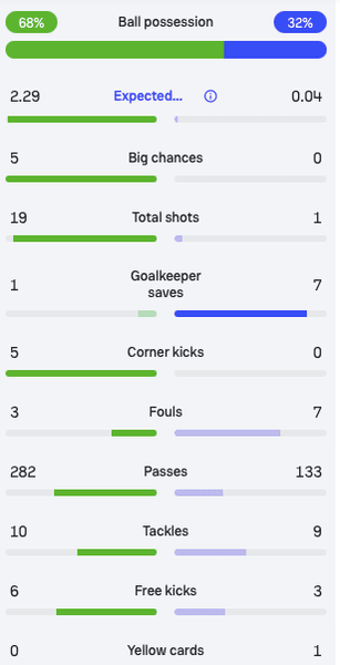 Статистика ударов по воротам после первого тайма: 19 к 1 в пользу хозяев.