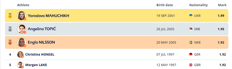 Сначала сербская спортсменка провалила первую попытку преодолеть высоту в 1,99 м, Магучих тоже не смогла взять эту планку. Во второй попытке украинке удалось преодолеть этот барьер, тогда как сербка не смогла ни со второй, ни с третьей попытки преодолеть отметку в 1,99 м.