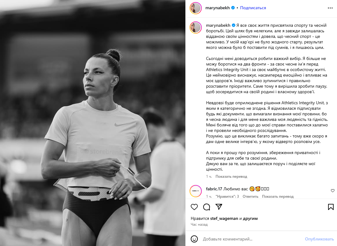 "Сегодня мне приходится делать трудный выбор. Я больше не могу бороться на два фронта – за свое честное имя перед Athletics Integrity Unit и за свое будущее в личной жизни. Это невероятно истощает, прежде всего, эмоционально и влияет на мое здоровье. Иногда важно остановиться и правильно расставить приоритеты. Именно поэтому я решила сделать паузу, чтобы сосредоточиться на своей семье и своем здоровье", – призналась спортсменка.