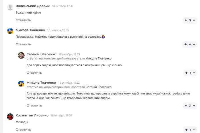 Пользователи бурно отреагировали на инцидент. Они назвали ситуацию "позорной" и призвали "гнать в шею" мужчину, который работает переводчиком в украинском баскетбольном клубе и при этом не может справиться с переводом с английского на украинский.