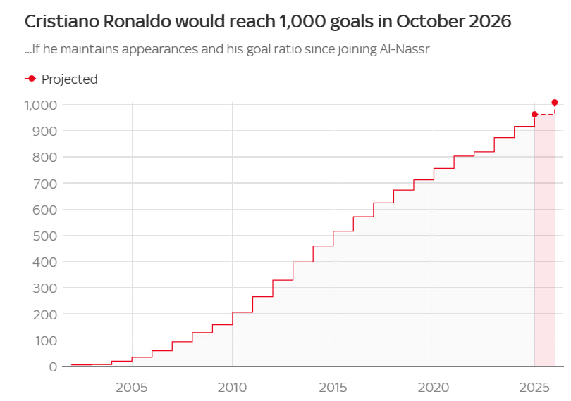 Sky Sports подсчитал, что если Роналду сохранит текущий темп забивания голов, то к октябрю 2026-го года сможет пересечь планку в 1000 забитых голов в карьере.