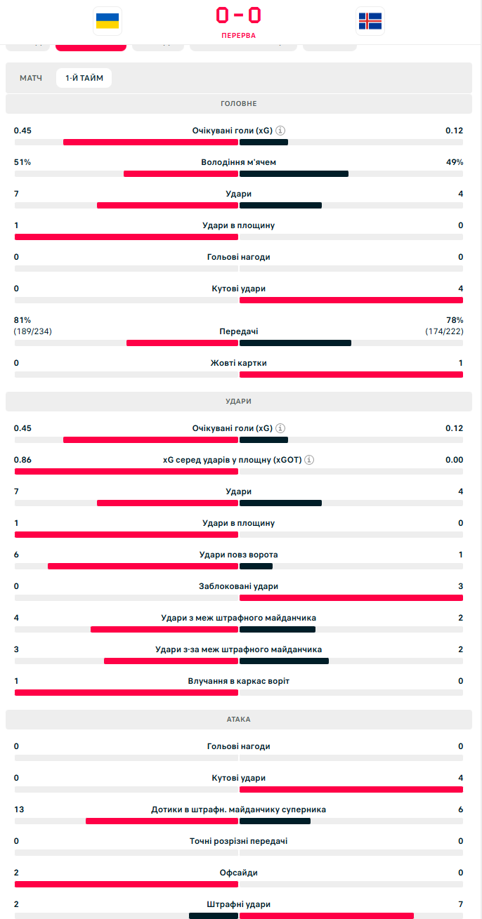 Украина — Исландия, статистика матча, статистика 1 тайма