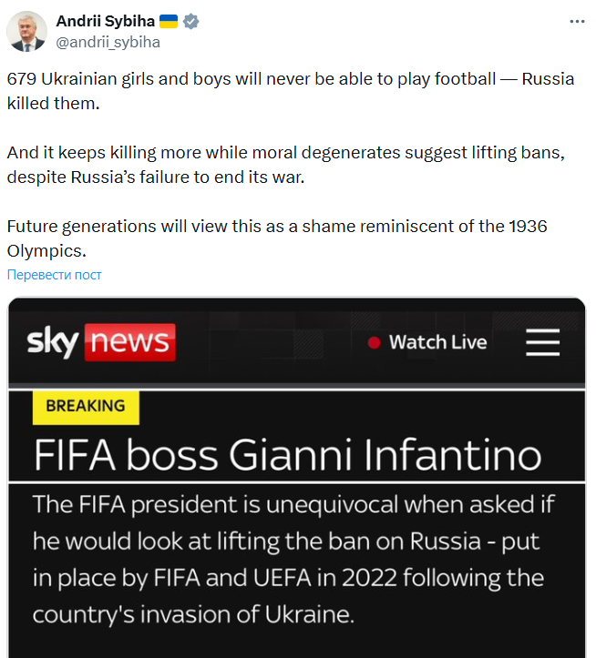 "679 украинских девушек и парней никогда не смогут играть в футбол — Россия их убила. И она продолжает убивать еще больше, пока моральные дегенераты предлагают отменить запреты. Несмотря на то, что Россия не прекратила войну. Будущие поколения будут считать это позором вроде Олимпиады 1936 года", — написал Сибига.