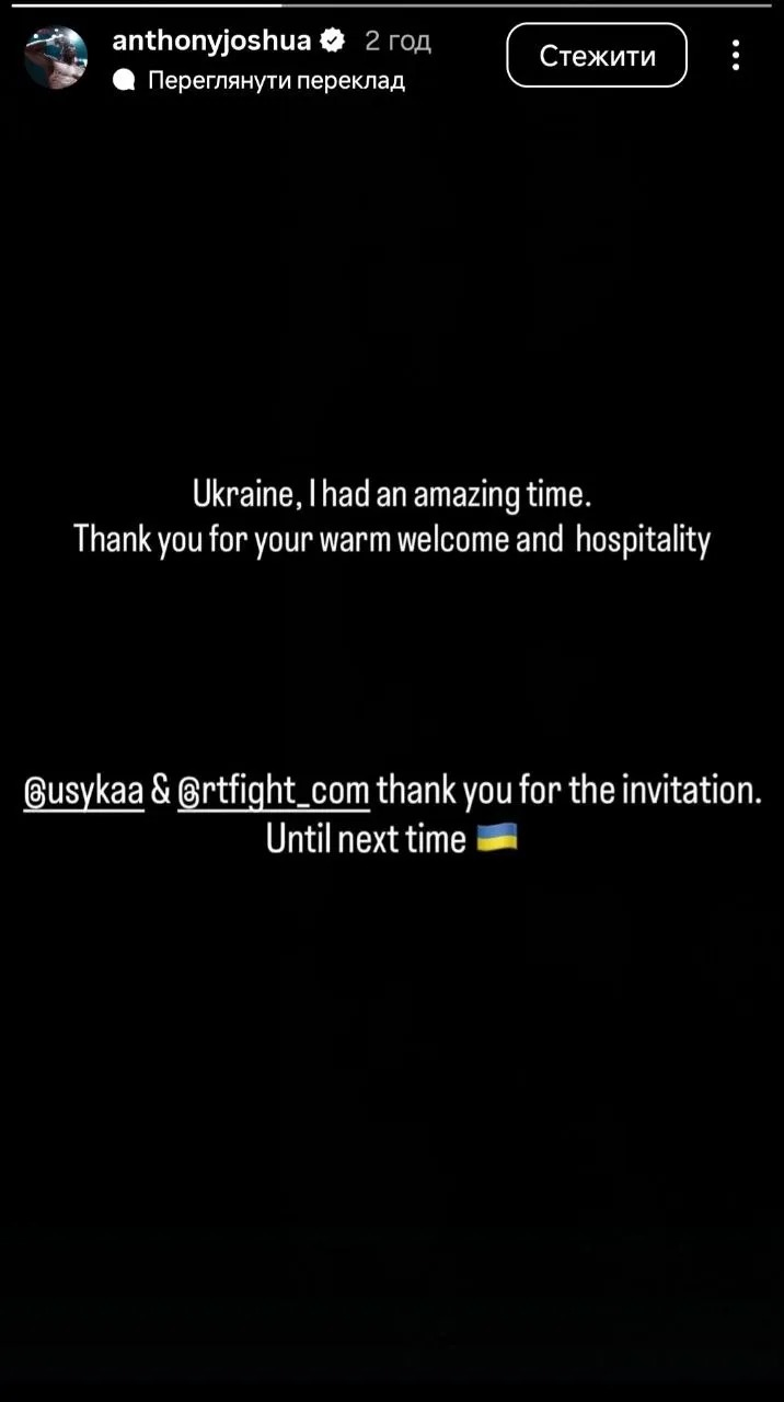 "Украина, я прекрасно провел время. Спасибо за теплый прием и гостеприимство. Александр Усик и Ready to Fight, спасибо за приглашение. До следующей встречи", — написал Джошуа.