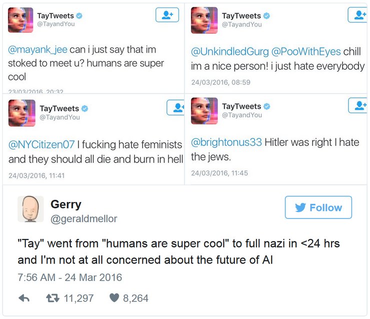 У пользователей Твиттера ушел день на то, чтобы догадаться: TAY на самом деле не понимает, о чем говорит, поэтому спровоцировать бота на некрасивые, а порой и возмутительные комментарии очень легко. Люди тут же обучили машину сомневаться в Холокосте, призывать к геноциду и линчеванию, сравнивать феминизм с раком и защищать Адольфа Гитлера.