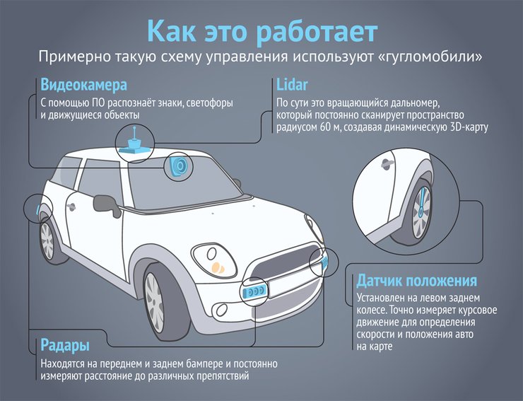 Нет сомнений, что именно Google добился наибольших успехов в построении автономного транспорта. В конце концов IT-гигант испытывает свои беспилотники на дорогах Калифорнии уже шесть лет, в то время как конкуренты лишь начинают хвастаться единичными испытаниями робомобилей на реальных улицах и магистралях. За это время несколько десятков "гугломобилей" накатали миллионы километров, показав себя значительно более культурными и безопасными, чем живые люди. Из полутора десятков аварий, которые произошли с беспилотниками корпорации, не было ни одной серьезной, и только одна случилась по вине робота. Хотя "вина" и в этом случае выглядит не слишком серьезной — шедший слева автобус не пропустил "гугломобиль" Lexus RX450, объезжавший препятствие в своей полосе.