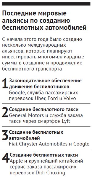 Чтобы справиться с этой проблемой, ряд компаний, которые работают над беспилотными технологиями, — Google, служба перевозок Uber, автопроизводители Volvo и Ford — недавно создали "Беспилотную коалицию за безопасные дороги". Возглавил ее Дэвид Стрикленд — экс-руководитель Национальной администрации по безопасности дорожного движения США. Главной задачей альянса стало законодательное разрешение эксплуатации беспилотников в развитых странах, а также забота о том, чтобы эти автомобили лучше воспринимали в политике и обществе.