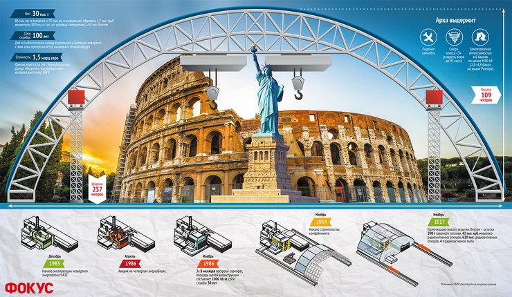 Над саркофагом четвертого блока ЧАЭС завершается возведение нового конфайнмента. Двухслойная стальная арочная конструкция, которая после герметизации (в 2017 году) должна простоять около 100 лет, позволяет вести внутри работы по демонтажу старого укрытия, а также извлечению и сортировке радиоактивных отходов