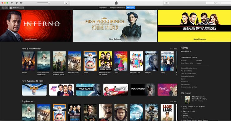 iTunes — магазин контента от компании Apple, доступен только на ее устройствах. Варианта подписки нет, стоимость аренды фильмов — от 70 грн, покупки (для новинок) — от 160 грн. Есть фильмы с украинским переводом.