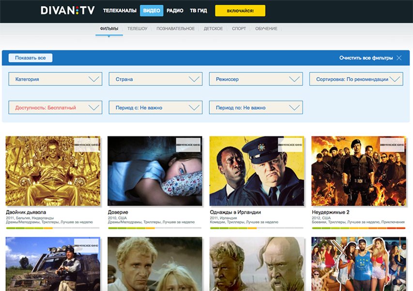 Сочетание онлайн-телевидения и онлайн-кинотеатра. 10 телеканалов из 178 можно смотреть бесплатно. Имеется архив видео, которое в большинстве случаев платное. Среди бесплатного контента в основном старые советские фильмы, американские мультфильмы 30-х и 40-х годов, а также некоторое количество образовательных передач. Интерфейс сайта позволяет легко отфильтровать бесплатный контент.