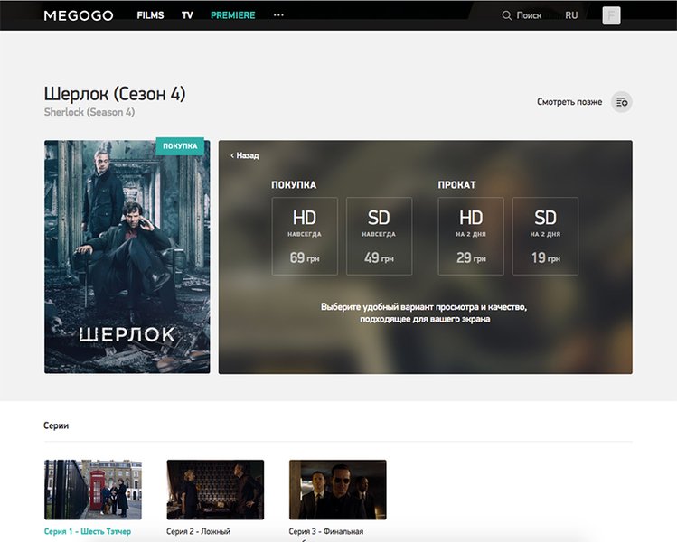 Многое на Megogo доступно бесплатно: чтобы посмотреть фильм, нужно лишь вытерпеть несколько рекламных роликов. Но картины или сериалы, которые вышли относительно недавно, бесплатно посмотреть не получится. Их можно покупать или брать напрокат на два дня. Стоимость зависит от фильма или сериала, качества изображения (SD или HD) и даты премьеры. Весь видеоконтент делится на три типа: бесплатный (доступный после просмотра рекламы), премиальный (69 грн в месяц) и премьерный (от 19 грн за одноразовый просмотр фильмов, вышедших более года назад, до 149 грн за последние новинки). Например, серию четвертого сезона "Шерлока" в HD-качестве можно купить за 69 грн или взять напрокат на два дня за 29 грн. Фильм "Джек Ричер 2: Никогда не возвращайся" в HD обойдется в 149 грн, в SD — в 59 грн.