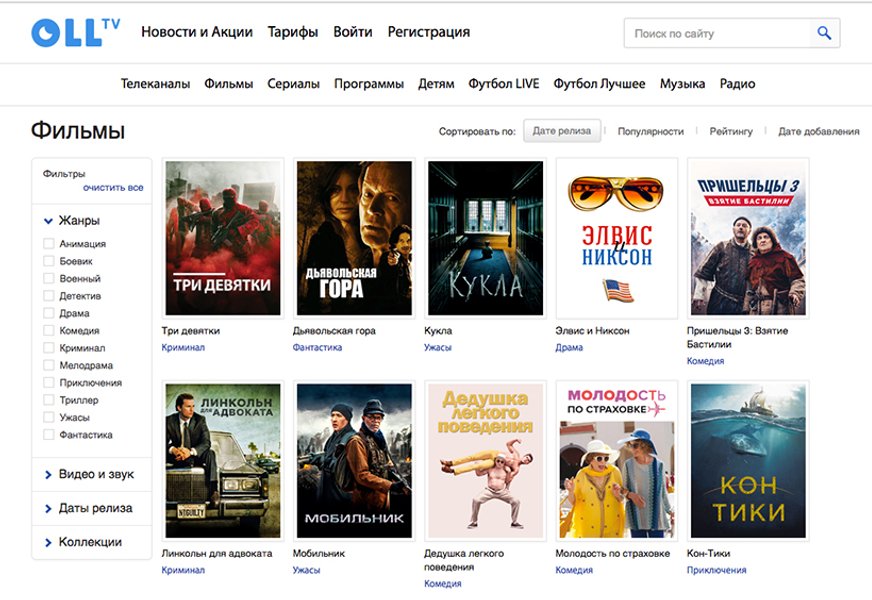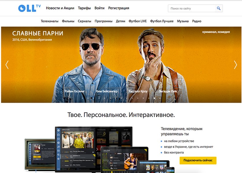 Онлайн-видеосервис Oll.tv предоставляет доступ к фильмам исключительно по подписке. Изначально сайт строился как онлайн-кинотеатр, но позже трансформировался в формат "IPTV + кинотеатр". Из популярных фильмов 2016 года можно отметить "Славных парней" Шейна Блэка. На сайте есть бесплатный контент, но отфильтровать его невозможно.