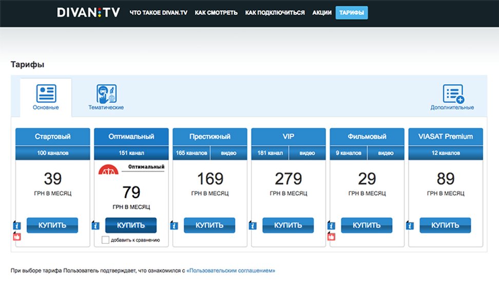 Платный контент распространяется по общей подписке. Заплатить за просмотр отдельного фильма или купить его нельзя. Придется выбрать и оплатить тот или иной пакет услуг сроком на месяц. В зависимости от наполнения тарифы варьируются в диапазоне от 29 грн до 279 грн в месяц.