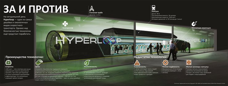 Hyperloop — предложенная в 2012-м американским изобретателем Илоном Маском концепция нового скоростного вида транспорта. По сути это поезд на магнитной или воздушной подушке, перемещающийся внутри трубы с низким давлением. Пассажиры или груз помещаются в капсулу, которую двигатель на электрической тяге разгоняет до скорости в 1200 км/ч. По расчетам Маска, Hyperloop станет самым экономичным способом передвижения. Так как капсулы скользят по трубе с откачанным воздухом, они практически не встречают сопротивления, и для работы Hyperloop достаточно энергии, вырабатываемой солнечными батареями. По идее Маска, дешевизна технологии позволит в сжатые сроки охватить сетью Hyperloop весь мир.