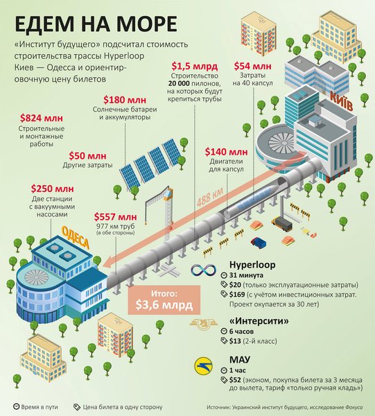 В итоге, по оценке Украинского института будущего, прогнозная стоимость Hyperloop по маршруту Киев — Одесса составит $3,6 млрд. При условии покрытия пассажиром лишь эксплуатационных расходов стоимость билета составит около $20. Это гораздо дешевле полета самолетом и сопоставимо с ценами на поезд. Однако если проект будет реализовывать частный инвестор, чтобы окупить работы за 30 лет, потребуется установить цену билета не ниже $169.