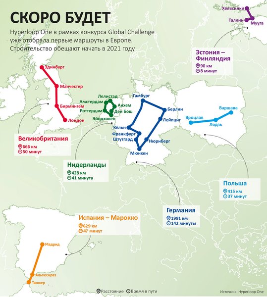 Основанная инвестором Uber Шервином Пишеваром компания Hyperloop One в июне этого года представила проект первых трасс Hyperloop в Европе. Компания планирует начать строительные работы уже к 2021 году.