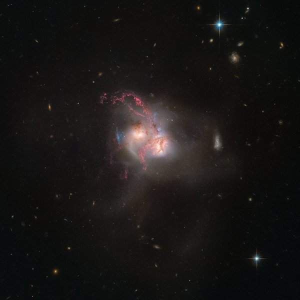 NGC 5256, также известная как Маркариан 266, находится в 350 миллионах световых лет от Земли в созвездии Большой Медведицы, и она прямо сейчас находится в процессе столкновения. Астрономы уже десятилетиями изучают ее. Она состоит из двух дисковых галактик, чьи ядра сейчас находятся всего лишь на расстоянии 13 тыс. световых лет друг от друга.