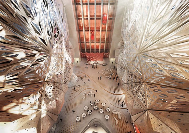Архитектурный экзоскелет состоит из двух башен высотой 160 м, 2,5 тыс. элементов и 1,2 тыс. соединений, выполненных преимущественно из алюминия и стекла повышенной прочности.