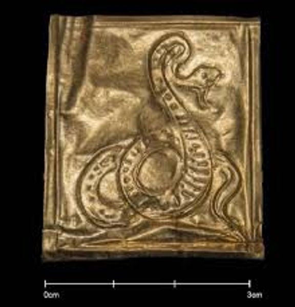 Изображения вырезаны на золотых пластинках. На первой пластине - змея без капюшона.