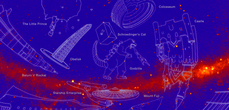 Новые созвездия получили имена в честь ученых (например, Альберта Эфнштейна), а также персонажей комиксов и фильмов, таких как Халк, Годзилла. Здесь можно найти и ТАРДИС - машину времени из сериала "Доктор Кто". Посмотреть всю карту можно на сайте NASA.
